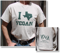 We still have a very few of our 2012 shirts, with the "I [texas] VEGAN" design (where the shape of Texas serves the same purpose as the heart in "I love NY"). These shirts have our old logo from the Vegetarian Network of Austin on the sleeve. We're out of the "Keep Austin Vegetarian" shirts from several years ago.Shirts are $20 each. These shirts are Fruit of the Loom all-cotton. Obviously sizes are limited, and we're out of the sage green.